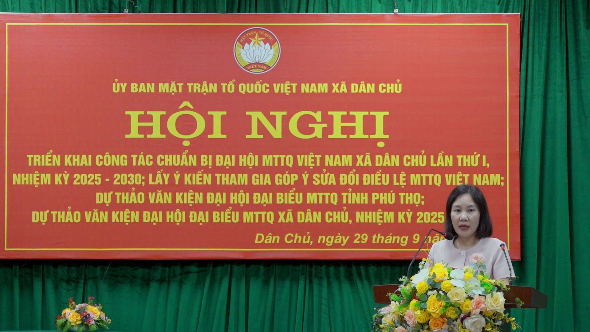 Hội nghị nhằm triển khai công tác chuẩn bị Đại hội MTTQ Việt Nam xã Dân Chủ lần thứ I, nhiệm kỳ 2025-2030; lấy ý kiến tham gia góp ý sửa đổi Điều lệ MTTQ Việt Nam; dự thảo văn kiện Đại hội đại biểu MTTQ Việt Nam tỉnh Phú Thọ; dự thảo văn kiện Đại hội đại biểu MTTQ Việt Nam xã Dân Chủ, nhiệm kỳ 2025 – 2030.