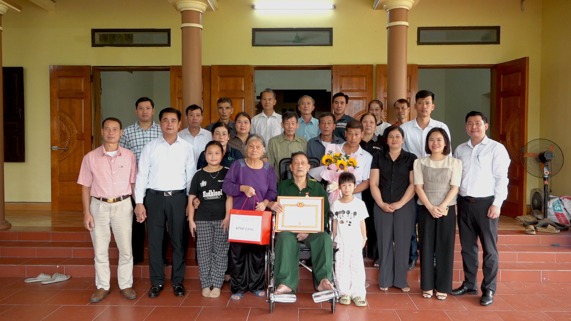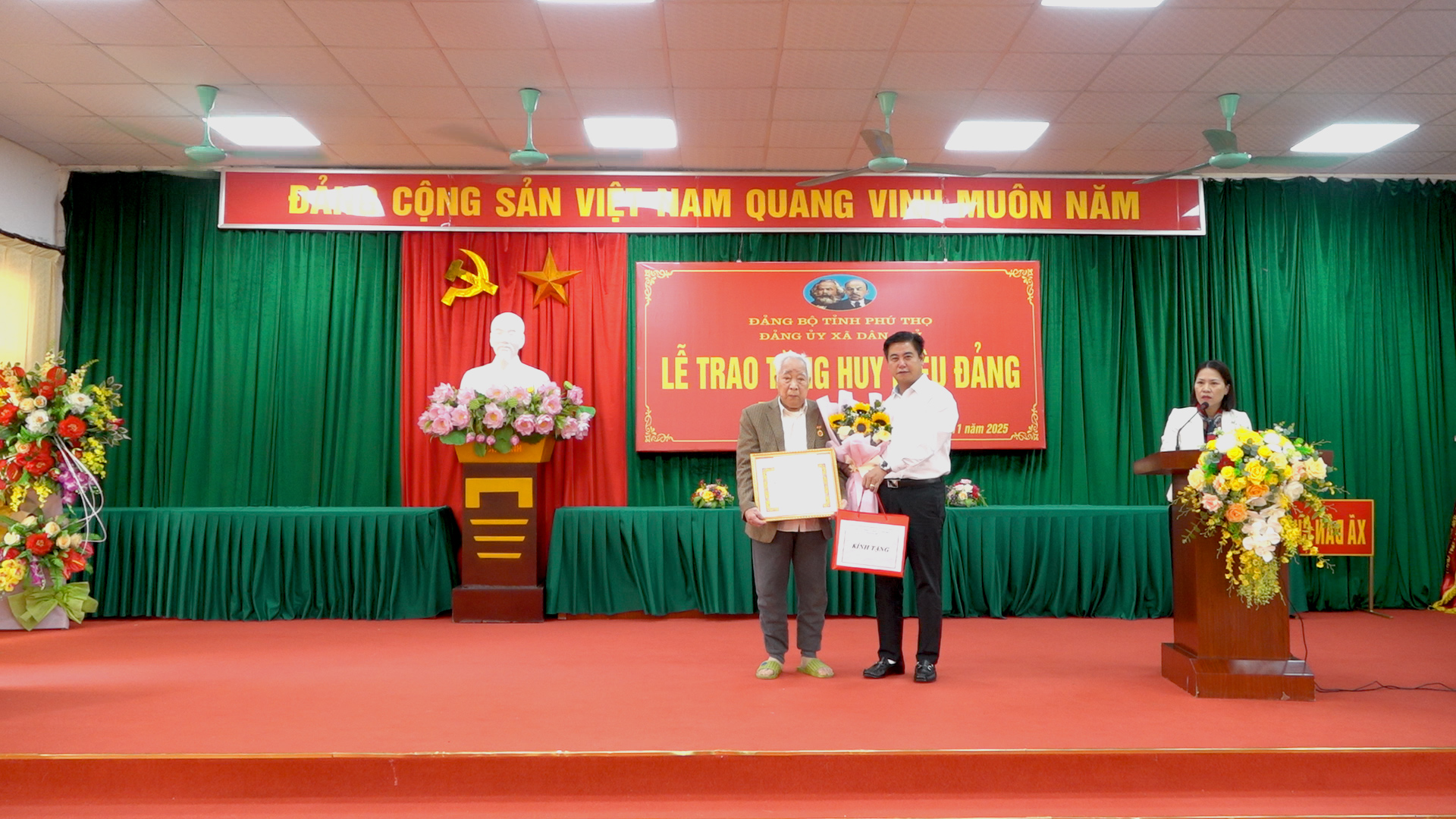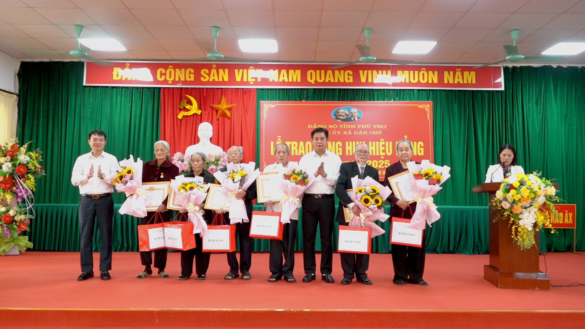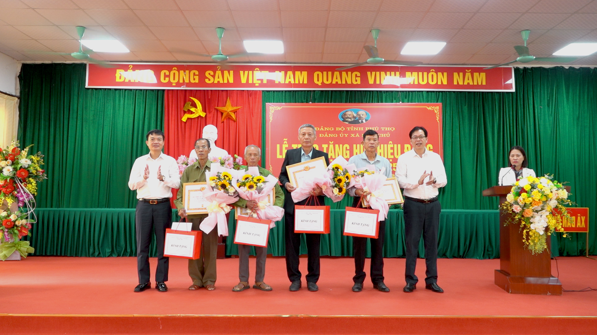 Tại buổi lễ, Đảng ủy xã đã trao tặng Huy hiệu 45, 60, 65 năm tuổi đảng cho 12 đồng chí Đảng viên, trong đó trao tặng Huy hiệu 45 năm tuổi đảng cho 4 đồng chí; Huy hiệu 60 năm tuổi đảng cho 7 đồng chí và Huy hiệu 65 năm tuổi đảng cho 1 đồng chí. Nhân dịp này, Đảng uỷ xã cũng đã tặng hoa và quà chúc mừng các đảng viên. Đây là phần thưởng cao quý của Đảng, ghi nhận những đóng góp tích cực của các đồng chí đảng viên lão thành trong những năm hoạt động cách mạng của mình cũng như trong sự nghiệp đấu tranh giải phóng dân tộc và xây dựng chủ nghĩa xã hội, là niềm tự hào của đảng bộ xã và gia đình.