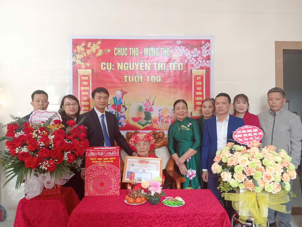 Đoàn do đồng chí Chủ tịch UBND xã đã đến thăm và tặng quà chúc thọ cho cụ Nguyễn Thị Tèo đăng thọ 100 tuổi tại gia đình cụ đồng thời ân cần thăm hỏi sức khoẻ, tinh thần và đời sống của cụ, chúc cụ sống lâu, sống vui, sống khoẻ là chỗ dựa, tấm gương sáng cho con cháu học tập, noi theo.