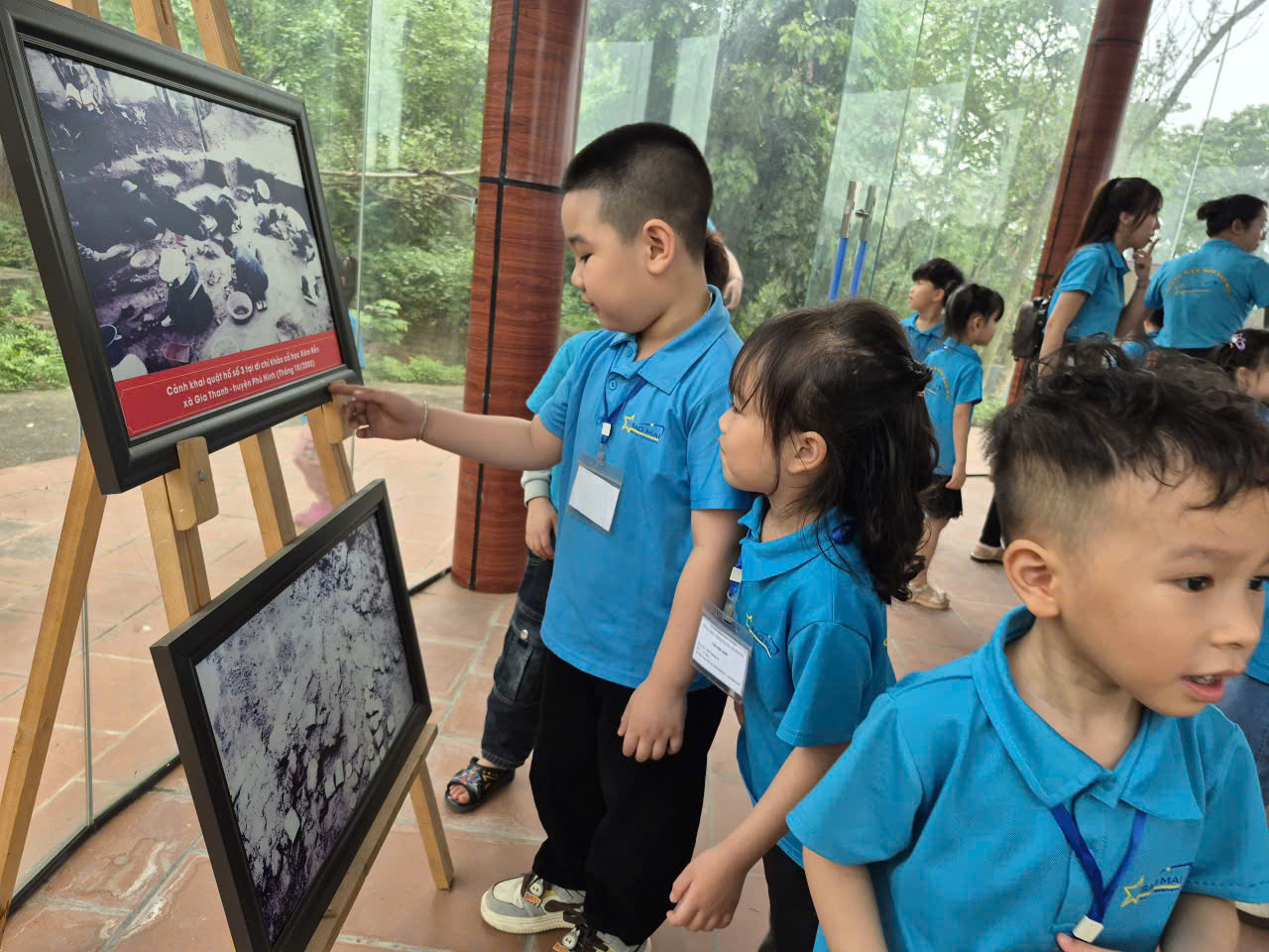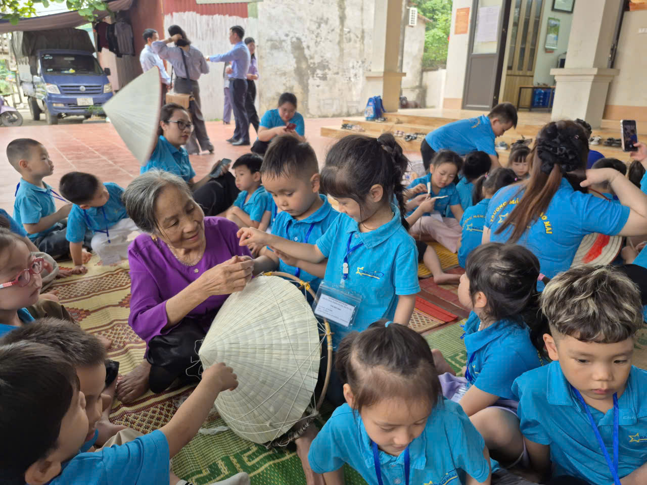 Đoàn gồm 130 học sinh lớp 4–5 tuổi cùng 16 cán bộ quản lý, giáo viên đã có hành trình trải nghiệm đầy ý nghĩa. Đoàn đã tham quan và dâng hương tại Khu di tích khảo cổ Quốc gia Xóm Rền. Tại đây, đoàn được Ban quản lý di tích giới thiệu về lịch sử khu di chỉ, nền văn minh thời Hùng Vương, các hiện vật được lưu trữ và được nghe những câu chuyện có chiều sâu lịch sử, văn hóa của vùng đất cổ. Đặc biệt, tại làng nghề nón lá Gia Thanh, dưới sự hướng dẫn tận tình của các nghệ nhân, các em nhỏ lần đầu tiên được trực tiếp quan sát và thử sức với từng công đoạn làm nón như xếp lá, lên khung, khâu nón… Những đôi tay nhỏ xinh, còn bỡ ngỡ nhưng đầy háo hức đã tạo nên một không gian trải nghiệm sinh động, tràn ngập tiếng cười.